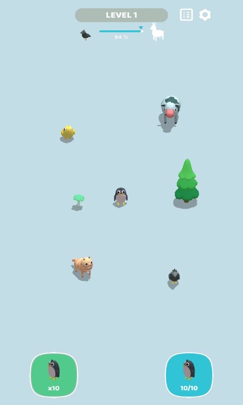 1、在【LEVEL 1】关卡开始时,观察屏幕下方的企鹅道具,利用其“x10”的数量,快速点击场景中的企鹅,推进关卡进度至【94%】。