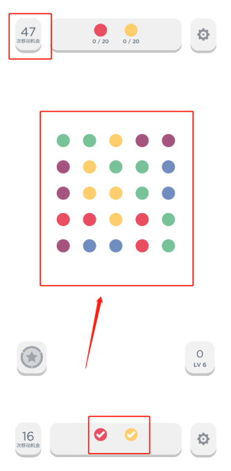 3、左上角显示的是本局游戏可移动次数,在中间收集带颜色的圆球,满足条件即可过关。