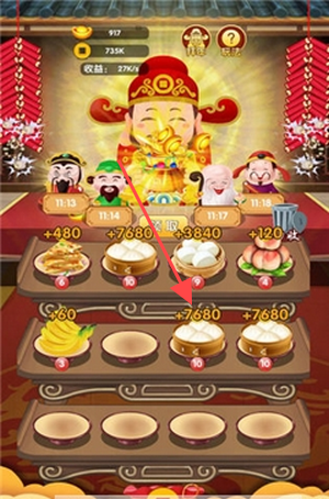 2、在游戏内界面,点击下方的食物图标或角色,获取收益(如735K、276%等),积累金额,这是增加收益的重要步骤。