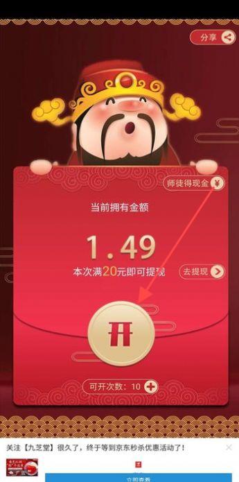 3、当出现红包界面时,点击红包上的【开】按钮,查看当前金额(如1.49元),积累至满20元即可提现,留意可开次数,合理操作获取更多现金。