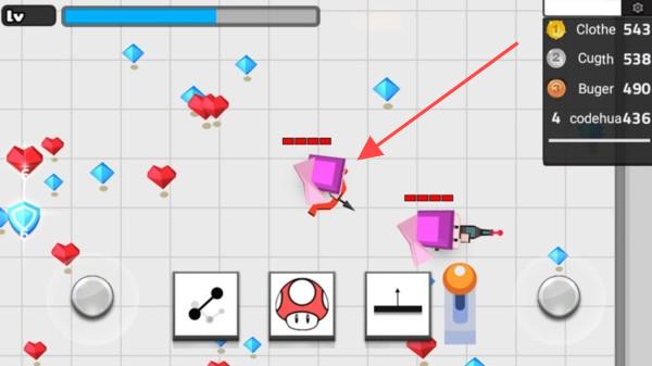 3、进入游戏战斗界面后,操控角色收集红心、钻石等道具,同时利用武器攻击敌人(如紫色方块敌人),留意右上角数值变化,合理规划战斗策略,提升游戏体验。