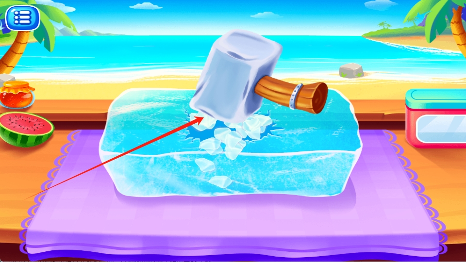 1、先将冰块击碎后获得冰块碎,根据指示将冰块碎放进机器里使机器外部可以产生冰,以便制作冰淇淋。