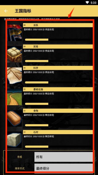 3、王国的指标主要侧重表现派系、贸易、科学、设施、食物、石材等方面的信息,能够反映出你王国的现状。