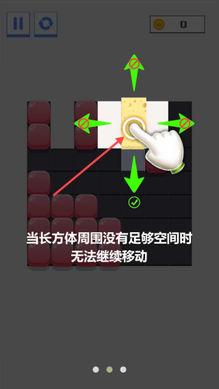 1、根据提示操作,理解【当长方体周围没有足够空间时无法继续移动】的规则,通过点击方块进行移动尝试。