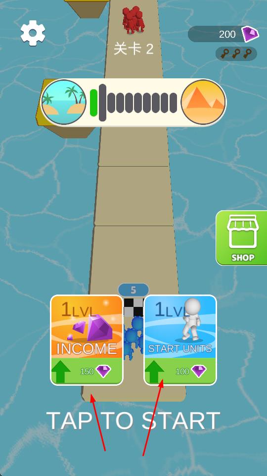 3、游戏设有关卡,玩家在关卡中完成任务,可使用收集的资源在商店升级收益、起始单位等属性。