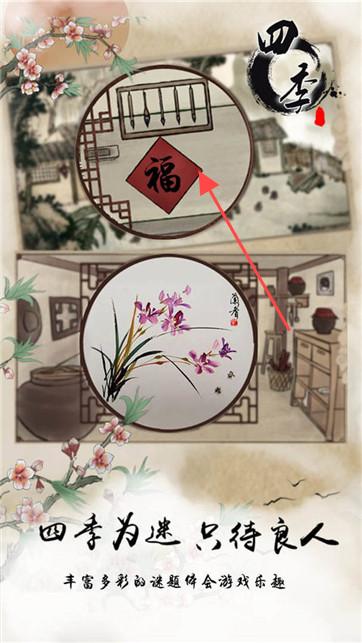 2、在游戏场景界面,若发现有 “福” 字、兰花绘画等元素,同时看到 “四季为谜 只待良人,丰富多彩的谜题体会游戏乐趣” 的提示,积极参与谜题玩法。