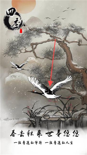 3、在游戏雪景画面中,依据松树与仙鹤的场景呈现,以及 “春去秋来 世事悠悠,一段普通的等待 一段普通的人生” 的文字描述,沉浸感受游戏的古风意境。