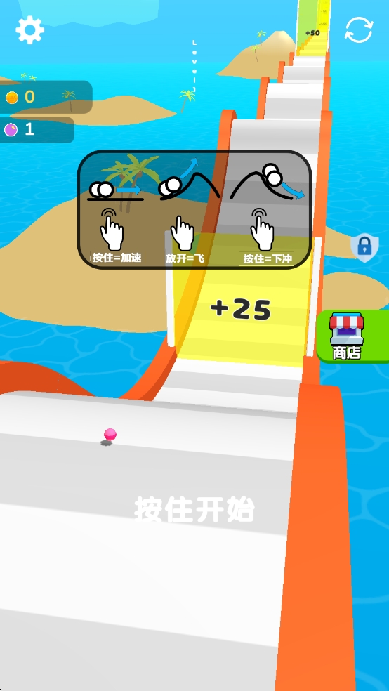 1、根据游戏开局提示,在平面的时候按住屏幕是加速。在上坡的时候按住是飞,在下坡的时候按住就是下冲。