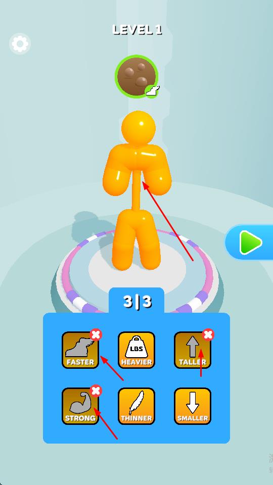 1、游戏开始前,玩家从更快、更重、更高等属性中选择3种,为橙色小人赋予初始能力。
