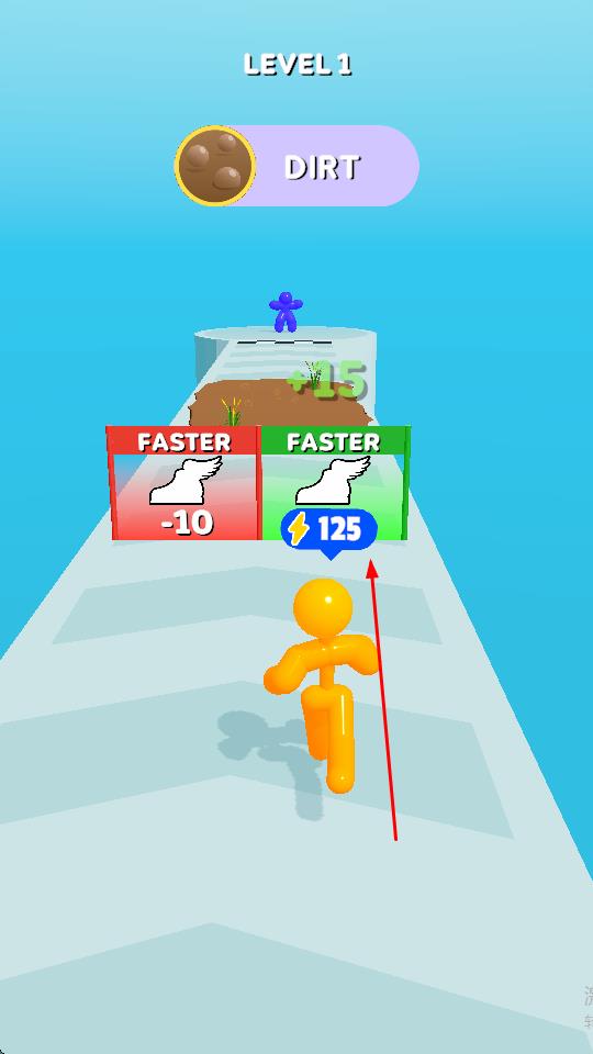 2、操控橙色小人在赛道上前进,途中可选择不同属性加成的区域,如红色速度减10和绿色速度加125区域。