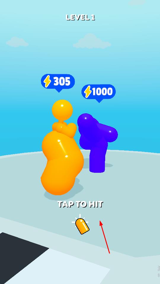 3、到达赛道终点后,与紫色小人对战,通过点击屏幕攻击对手,利用行进过程中积累的属性优势击败对手。