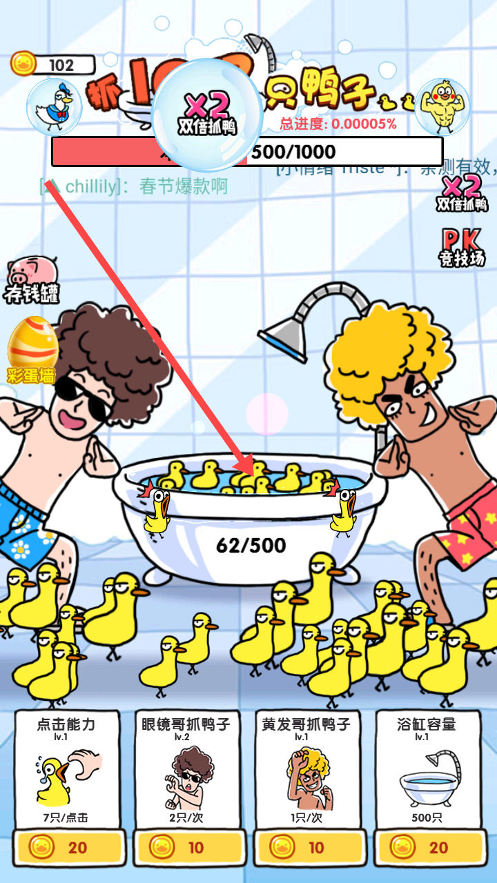 2、游戏过程中利用【双倍抓鸭】等增益效果,快速抓取鸭子,同时关注浴缸鸭子数量(如62/500),适时升级能力提高抓鸭效率。