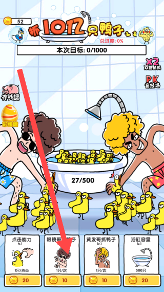 3、根据金币数量,合理升级【点击能力】【眼镜哥抓鸭子】等功能,提升抓鸭数量和速度,助力完成【本次目标】抓鸭任务。