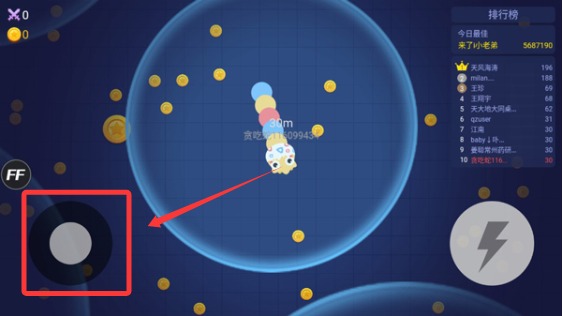 1、控制摇杆走位,吃掉地图上金币,就会变长,长按加速,用巧妙的走位让蛇身被别人撞上,就可以吃掉对方收集的金币迅速变长。