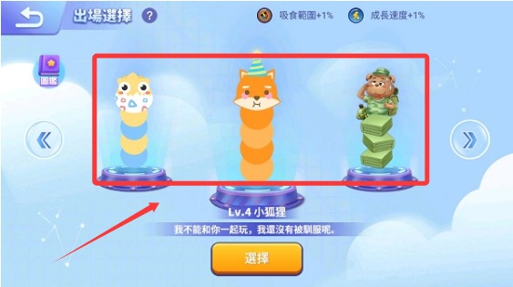 3、游戏中的贪吃蛇默认的造型都是依据最高等级前往对战战场的,想要按照你喜欢的形象,需要手动设置,点击大厅左侧的贪吃蛇进入出场选择,在你喜欢的角色里点击选择即可。