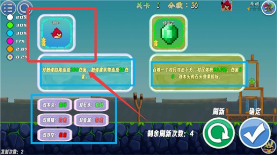 2、在每轮准备射击时,系统会自动分配一只能力随机的鸟,根据它的特性灵活制定攻击路线。