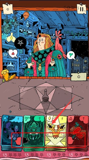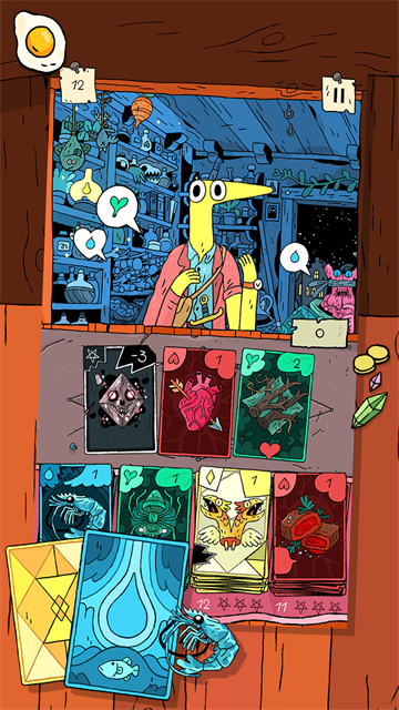 1、每位顾客头顶显示所需与偏好成分,需根据提示组合四张卡牌完成药剂合成。