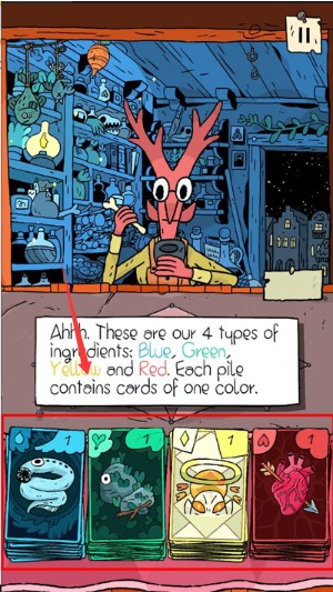 2、游戏中共包含蓝、绿、黄、红四种成分卡牌,每轮选取四张进行组合,创造独特魔药。
