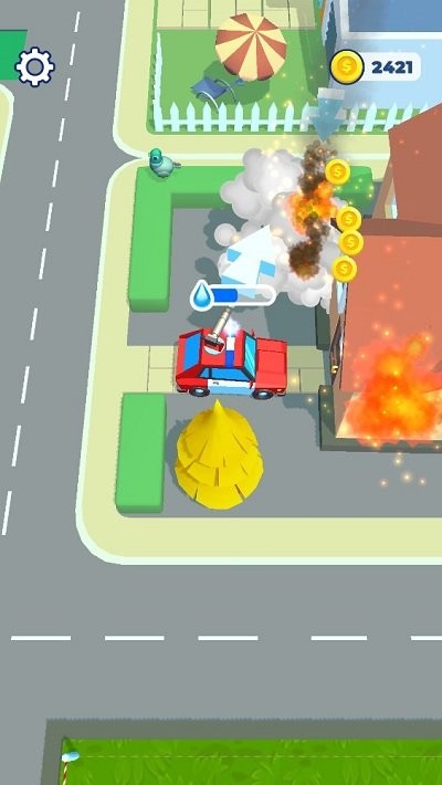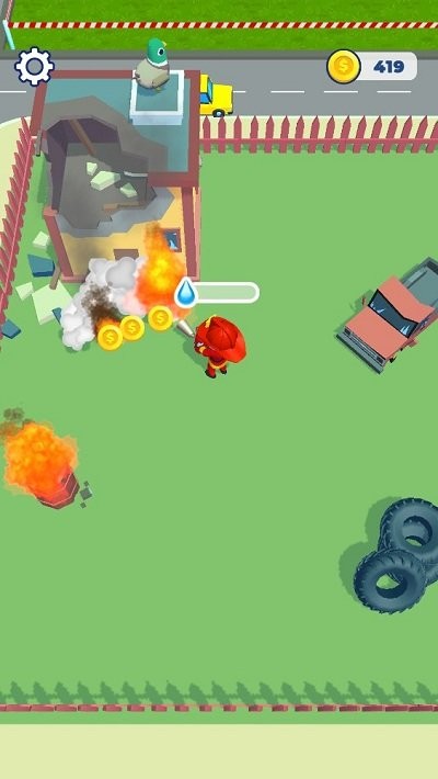 1、进入闲置火力世界玩家化身消防员,驾驶卡通消防车抵达首个火灾现场,点击屏幕喷水灭火,开启救援之旅。