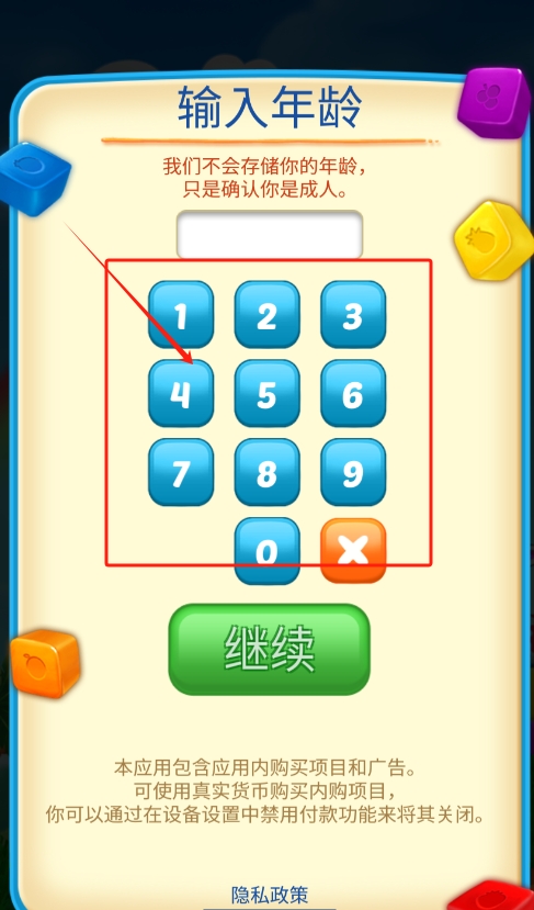 1、打开水果方块爆炸,在年龄输入界面,用数字键盘输入年龄,点击继续确认身份。