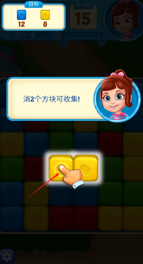 3、在游戏关卡中,按照消2个方块可收集提示,点击相同水果方块进行消除,完成目标。