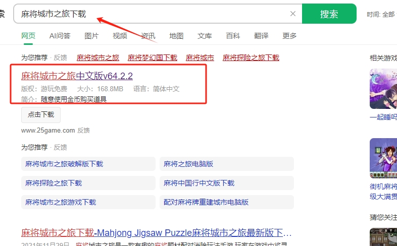 1、在网站上搜索麻将城市之旅下载,并点击图片标记的链接进去下载。
