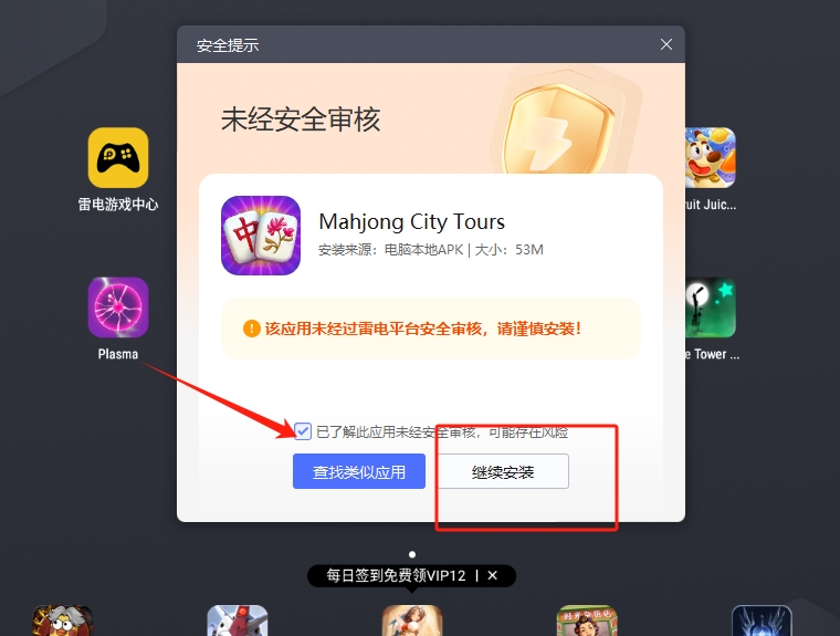 3、将麻将城市之旅apk拖入到雷电模拟器,点击已了解此应用,再点击继续游戏即可进入游玩。