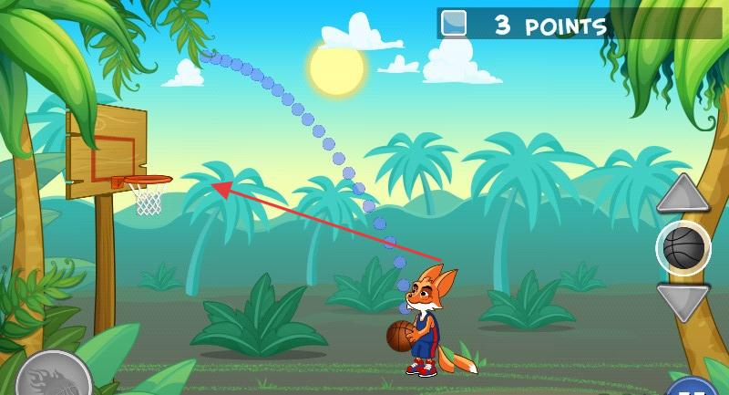 2、游戏中调整吉米投篮角度,观察抛物线轨迹,对准篮筐准备投篮。
