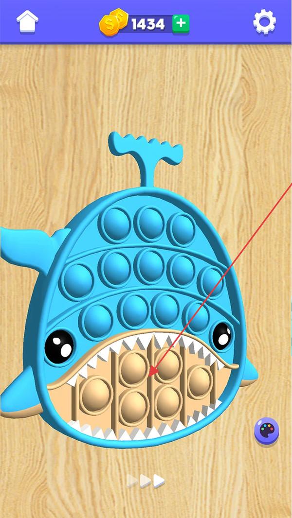 2、在鲸鱼形状泡泡玩具界面,留意上方金币数值,按箭头指示点击泡泡,完成游戏内互动操作,获取相应反馈。