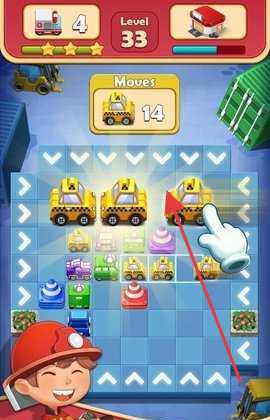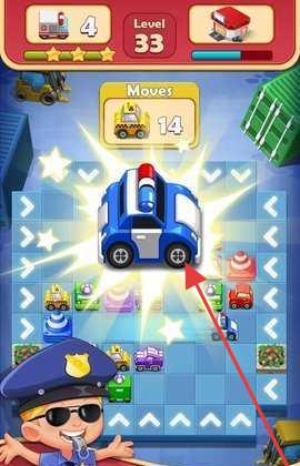 3、在【Level 33】中,将车辆移动到合适位置进行匹配消除,如合成蓝色警车可获特效。尽量触发特效组合,利用有限步数消除更多车辆,顺利通关。