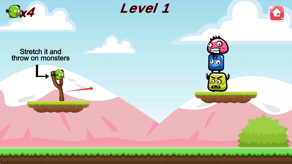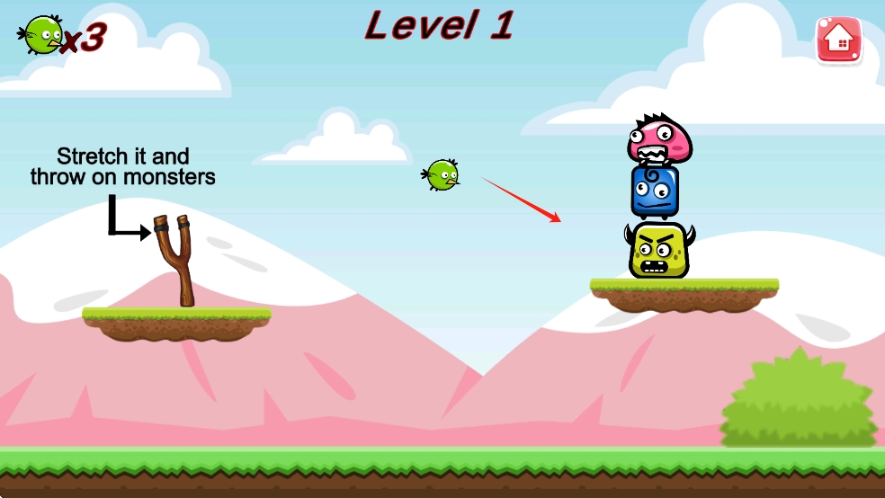 1、进入小鸟弹射器世界,玩家首先调整弹弓角度与力度,瞄准关卡内的目标物品,松手发射小鸟开启首次消除挑战。