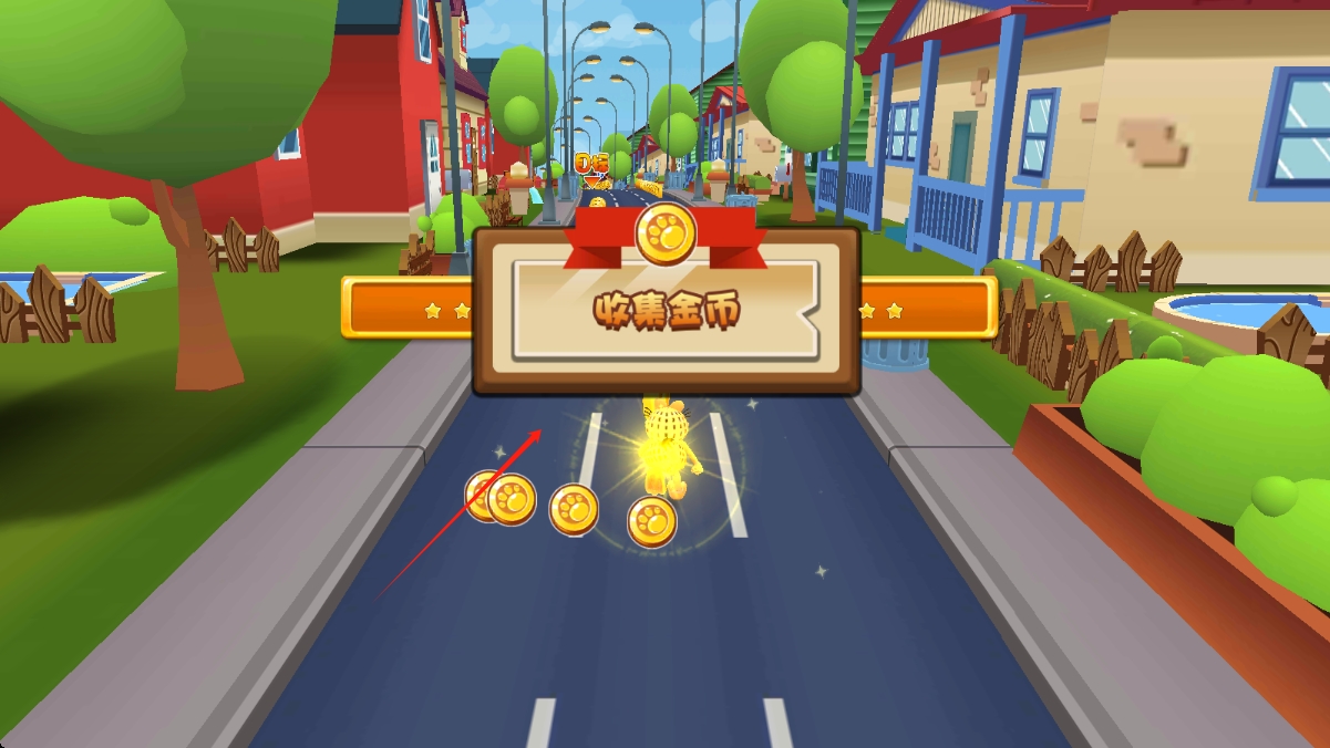 1、进入街道场景,操控角色沿着道路前进,按照提示收集道路上的金币。