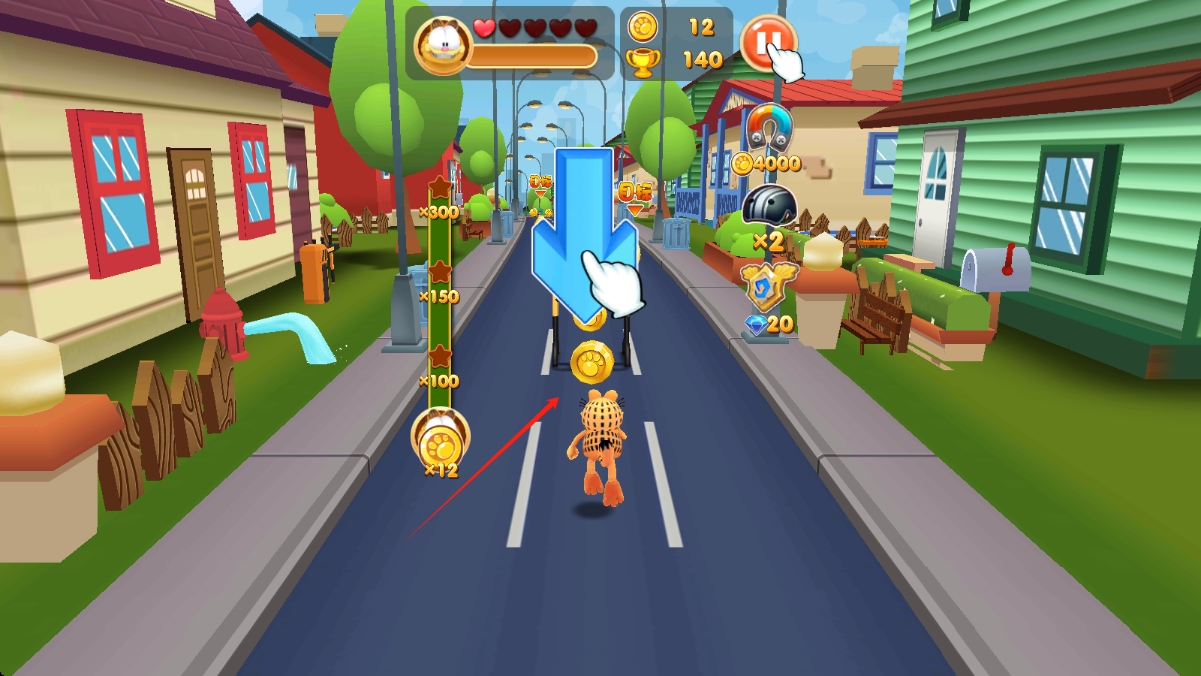 1、触屏滑动操作:通过上下左右滑动屏幕控制加菲猫动作,向上跳跃躲避路障向下翻滚穿过缝隙左右平移避开危险,简单操作即可完成复杂跑酷动作,考验反应速度与手眼协调。