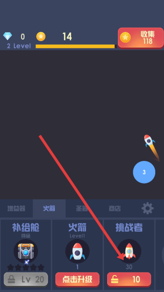 2、在火箭仓库界面点击解锁,消耗积累的金币获取并发射出独特、性能更强的新火箭。