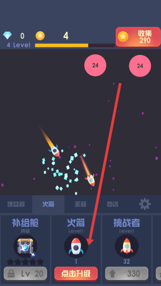2、火箭养成策略:优先升级高伤害火箭应对BOSS关卡,或解锁新火箭扩展射击模式,拥有直线穿透与扇形散射火箭,覆盖攻击范围。