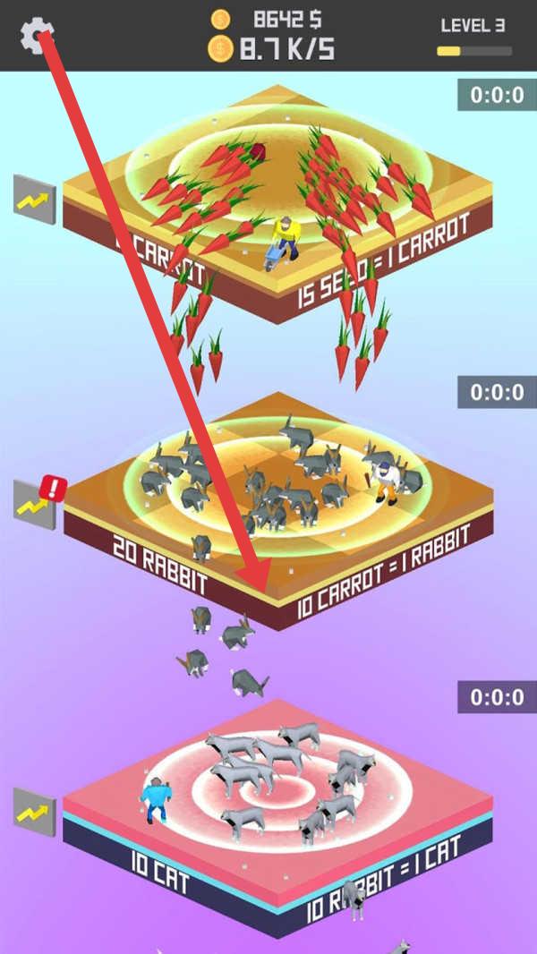 1、在【LEVEL 3】,观察各平台上的资源转化规则(如【15 SEC=1CARROT】),合理分配资源,利用上方平台产出的胡萝卜,转化为兔子等资源。