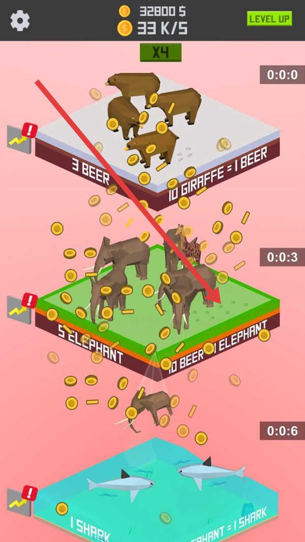2、看到不同动物和资源转化(如【3 BEER=1GIRAFFE】),把握时间(【0:0:3】),促进资源转化和金币获取,关注金币收益(【33K/5】),适时升级。