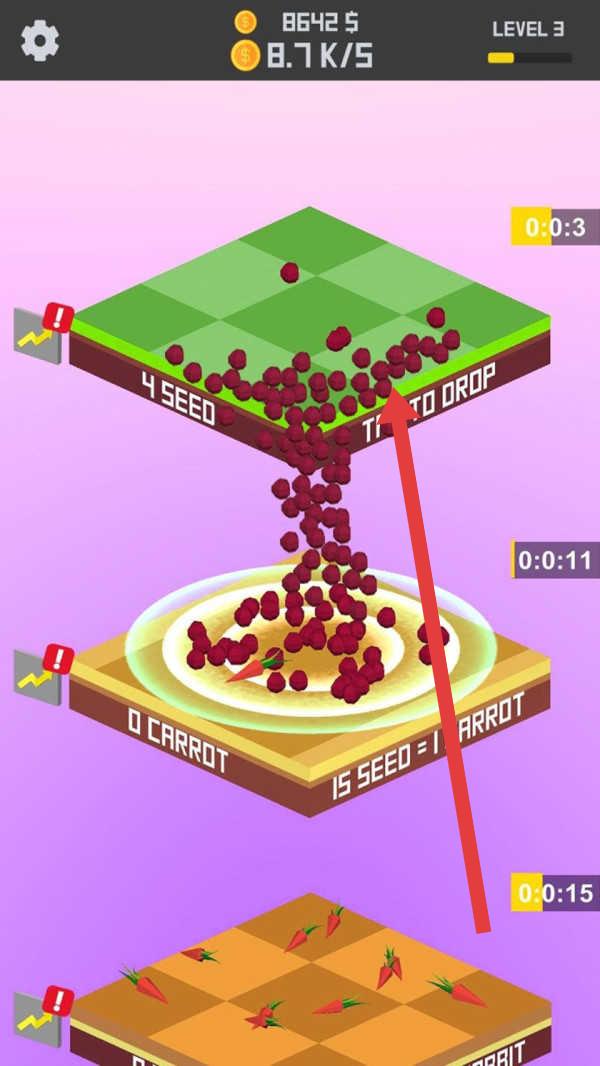 3、依据【45 SEED TO DROP】提示,在规定时间(【0:0:11】)内,将种子转化为胡萝卜,再进一步转化资源,推动游戏进程,提升关卡等级。