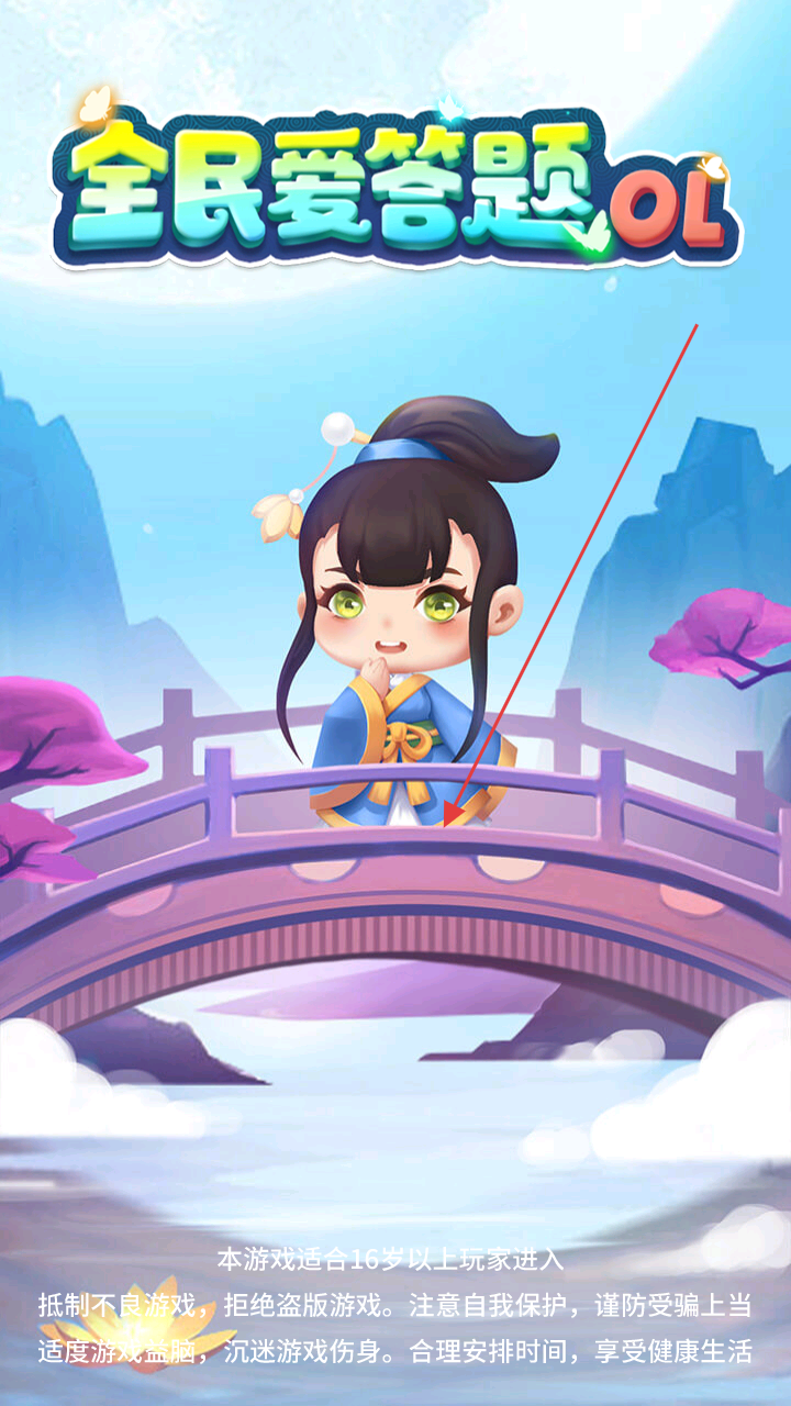 1、进入游戏,主界面展示“全民爱答题OL”标题,卡通女孩形象可爱,背景有山水桥梁,下方提示适合16岁以上玩家,倡导健康游戏。