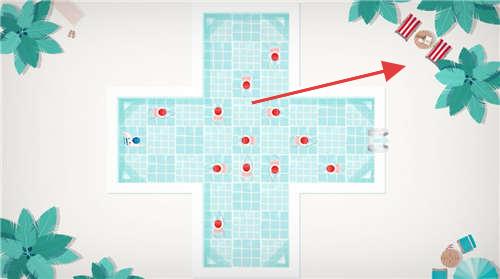2、面对十字形泳池布局,观察多个红色圆点分布,按箭头指引向右侧物品移动,收集或完成对应操作,为游戏进程奠定基础。