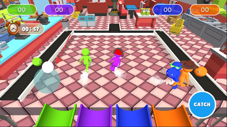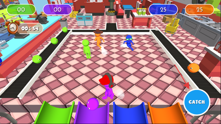 2、3D卡通绚丽画面:采用精美3D卡通画质,色彩绚丽多彩,五光十色的橡皮人头与多样场景(如超市、工厂)充满艺术美感,在视觉上营造出夸张而欢乐的竞技氛围。