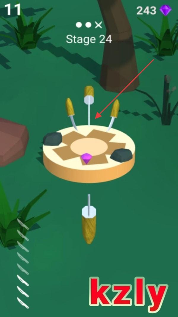 1、进入游戏界面,留意左上角数字如11、243及“Stage24”,中间圆盘插着刀具,瞄准空隙投掷,收集紫色宝石,这是关卡挑战的关键。