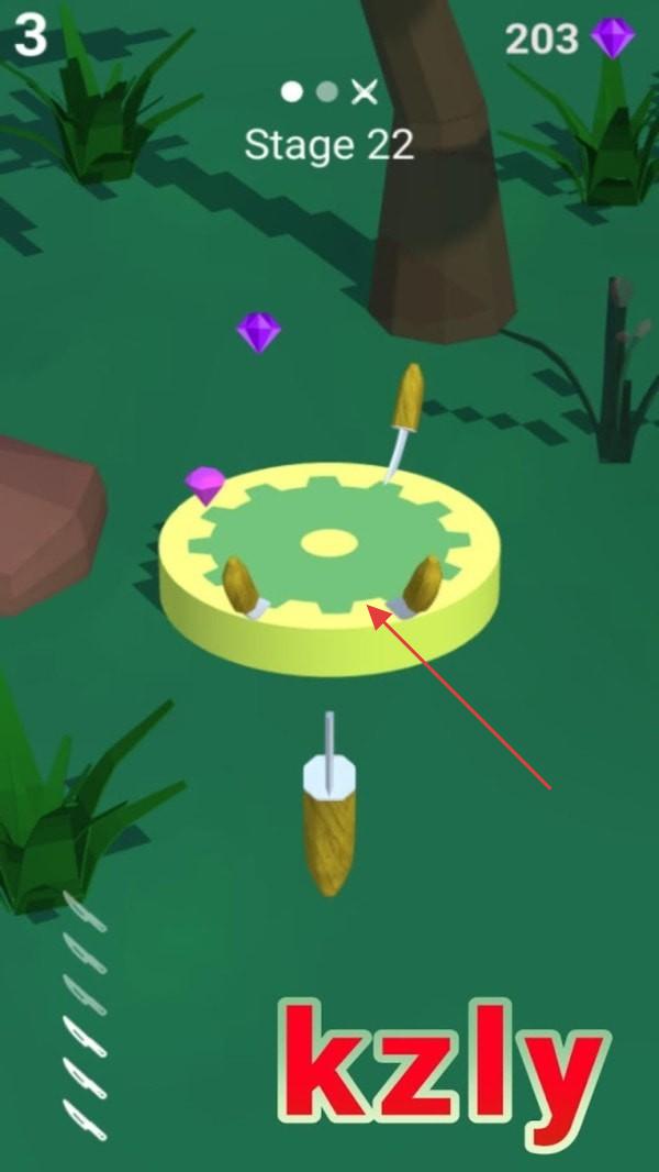 3、在“Stage22”界面,如数字3、203所示,圆盘有刀具和宝石,精准投掷飞刀,避开已有刀具,收集宝石,完成关卡目标。