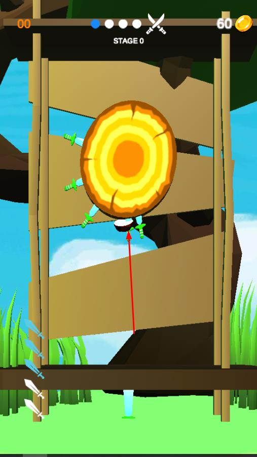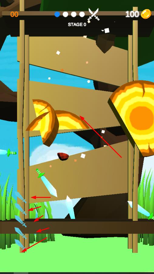 1、玩家点击屏幕投掷飞刀,目标是击中旋转的木板和圆盘,使其破碎。