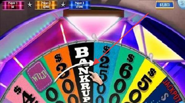 3、游戏中转动轮盘,留意轮盘区域如【BANKRUPT】,指针指向该区域会清空奖金,尽量避开,争取转到高金额区域赢取奖金。