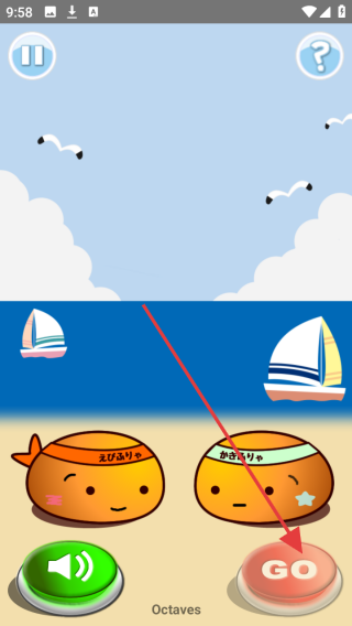 3、进入关卡游戏画面,看到两个卡通角色,点击【GO】按钮开始游戏,可借助左下角声音按钮辅助,学习音乐知识并完成挑战。
