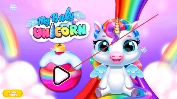 1、打开myBabyUNICORN游戏,点击画面中带有播放按钮的彩色图标进入游戏,开启照顾独角兽宝宝之旅。