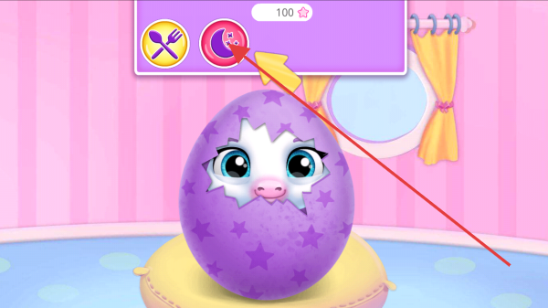 3、出现带眼睛的紫色蛋时,关注上方状态标识(如进食、睡眠),按需点击对应图标(如【叉子】代表喂食)照顾蛋中独角兽宝宝,积累【100★】。