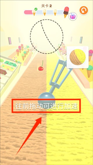 1、冰淇淋快跑游戏有着极为独特的游戏特色。玩家在游戏里需操控勺子在移动的冰淇淋中挖取小球。通过精心操作,能够制作出外观精美、口味诱人的冰淇淋球。