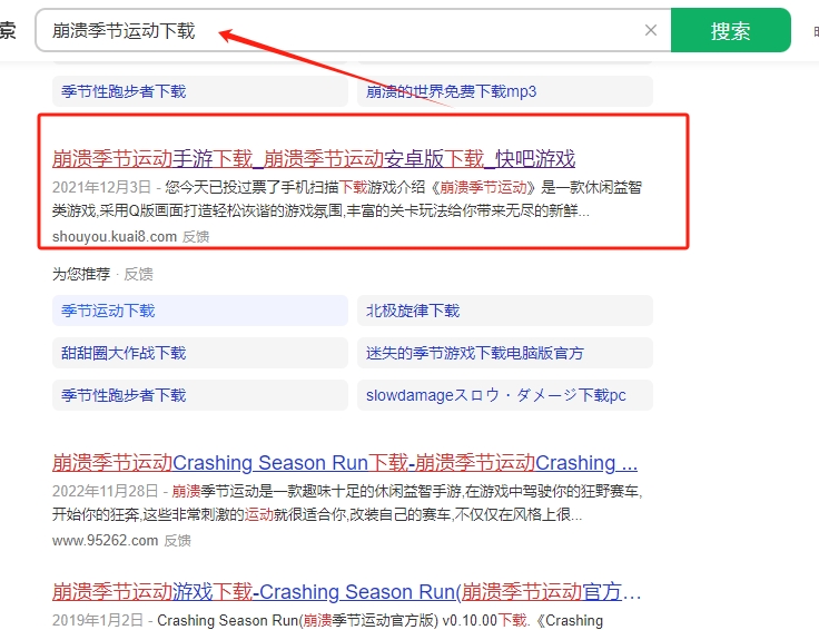1、在网站上搜索崩溃季节运动下载,并点击图片标记的链接进去下载。
